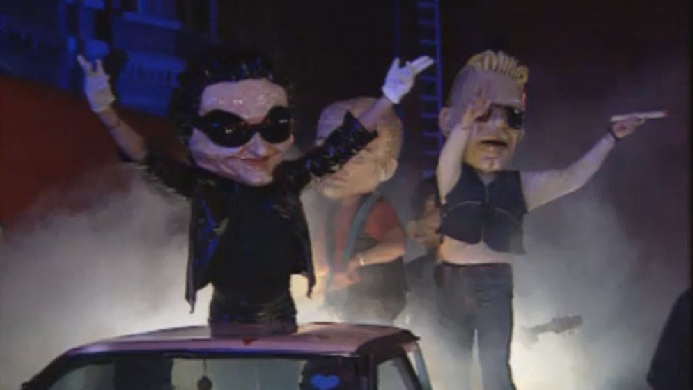 "Macnas imitations of U2 members put on a display for the grand opening before the