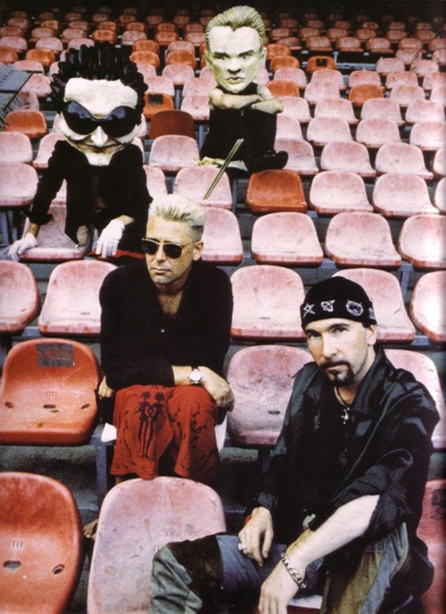 Massive Heeds Bono and Larry Mullen Jr with the real Adam Clayton and The Edge during the Zooropa Tour, 1993.